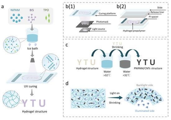 (a) Preparation of PNIPAM prepolymer. (b(1)) UV curing device. (b(2)) Structural composition of UV curing platform. (c) Impregnation of CNTs giving the hydrogel sheet photothermal characteristics. (d) Photothermal deformation of PNIPAM sheet impregnated with CNTs.