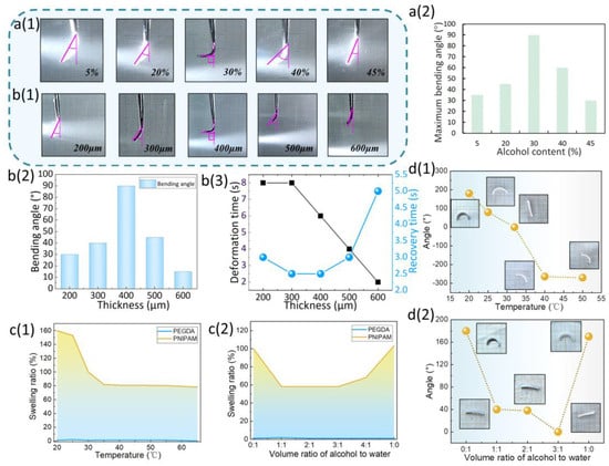 (a(1)) PNIPAM strips with different alcohol content responding to light. (a(2)) Relationship between alcohol content and the maximum bending angle of PNIPAM strip. (b(1)) PNIPAM strips with different thicknesses responding to light. (b(2)) Relationship between thickness and the maximum bending angle of PNIPAM strip. (b(3)) Relationship between thickness and the deformation/recovery time of PNIPAM strip. (c(1)) Relationship between temperature and the swelling ratio of PNIPAM/PEGDA hydrogels. (c(2)) Relationship between solvent composition and the swelling ratio of PNIPAM/PEGDA hydrogels. (d(1)) Relationship between temperature and the bending angle of PNIPAM–PEGDA bilayer hydrogel. (d(2)) Relationship between solvent composition and the bending angle of PNIPAM–PEGDA bilayer hydrogel.