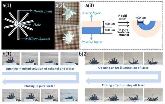 (a(1)) Photomask of bionic flower. (a(2)) Deformation of single-layer bionic flower. (a(3)) Structure diagram of the bilayer bionic flower. (b(1)) Bionic flower responding to the change in solvent composition. (b(2)) Bionic flower responding to the laser.
