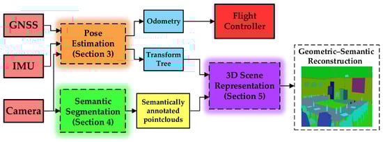 In recent years, some studies have proposed partial solutions to these problems, such as simultaneous localization and mapping (SLAM) [1,2,3,4,5,6], autonomous path replanning [7,8,9,10], pattern recognition [11,12,13,14], and iterative reconstruction [15,16,17]. Nevertheless, research in these fields has traditionally proceeded in isolation, and there is currently no complete full-stack solution for scene parsing. Scene understanding in unknown environments still remains an enormous challenge because of the time-varying situations and stringent requirements for computing power, system latency, and energy consumption caused by the limited resources of agents.
