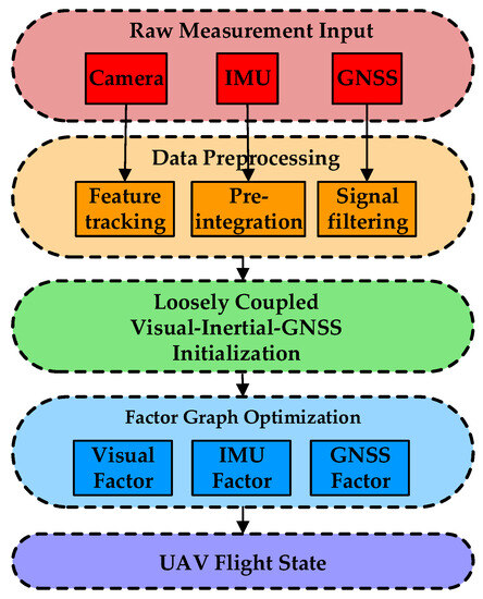 Finally, the UAV pose can be obtained by optimizing the UAV state vector by employing probability factor graph optimization. For the detailed process of factor graph optimization, please refer to our previous literature [32,33,34,35].