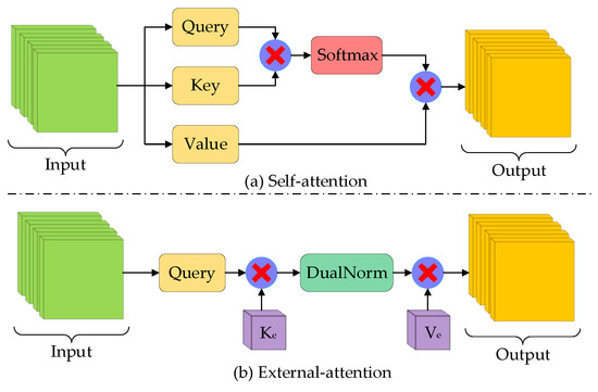 To address these disadvantages, a flexible and lightweight attention mechanism called external attention (EA) was invented, which manufactures an attention map between a query matrix Qe and two different learnable memory units, Ke and Ve, as the key and value, respectively. The illustration of external attention is shown in Figure 4b. The memory unit is an external parameter matrix independent of the query matrix, which acts as a prior and traverses the whole sample. The external-attention mechanism can be expressed by the following formula: