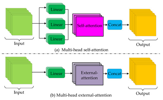 where, as in Formula (4), the symbol headi represents the input channel, H is the number of heads, and i is the ith head. are the shared multi-head parameter matrices, . Although the external-attention mechanism leverages shared parameter matrices to calculate the attention map corresponding to different heads, the system latency caused by excessive matrix computation still remains.