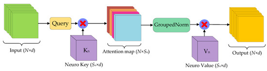 where is the neuro-like attention input query matrix and are the external learnable parameter matrices, . GroupedNorm denotes the grouped normalization operation, which distributes the original double normalization into H channels.