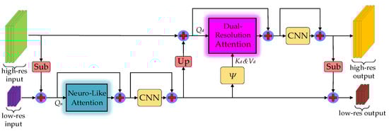 Before building a complete artificial neural architecture, it is necessary to construct the essential components of the neural network, namely the network block. In order to fuse feature information from different resolution branches, we designed an innovative neural network sub-module with the dual branch structure, dubbed BatNet block, as exhibited in Figure 7. In contrast to the previous works, the BatNet block consists of two types of attention modules along with their convolutional neural network (CNN). Dual-resolution attention and neuro-like attention modules are respectively embedded into high-resolution and low-resolution branches. Neuro-like attention inherits the linear complexity from the EA mechanism, and dispenses with the multi-head mechanism to reduce the system latency on the neuro-like computing architecture. Additionally, the neuro-like attention module reasonably expands the number of learnable parameters in external memory units. We ingeniously arrange the dual-resolution branches into a stepped layout. The K and V parameter matrices in dual-resolution attention are obtained by transforming the global context information generated from the low-resolution branch. Consequently, the high-resolution branch can capture global contextual information from the low-resolution branch.