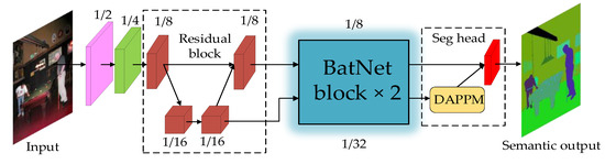 The top of the BatNet is a segmentation head, which is used to predict the category of each pixel. At the end of the low-resolution branch, we inserted a deep aggregation pyramid pooling module (DAPPM) [37,38] to expand the feature map size to match the high-resolution branch. The final feature map size after fusion is 1/8 of the input image. The segmentation head involves a 3 × 3 convolutional layer and a 1 × 1 convolutional layer, while the feature map dimension is the same as that of the input. Ultimately, the output features are categorized at the pixel level to densely predict semantic labels.