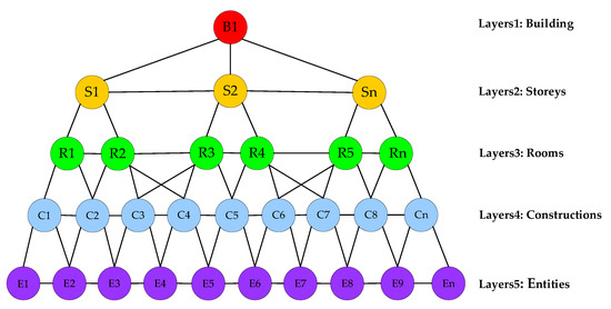 The hierarchical scene graph of a multi-story building scene includes five layers from high to low abstraction level: building, stories, rooms, constructions, and entities, as shown in Figure 9. Each abstract or corporeal object in the physical scene has a unique vertex corresponding to it in the hierarchical scene graph. The proposed HSG is constructed with agents’ high-level semantic navigation in mind. For example, consumers can directly issue high-level commands to the agent through dictation: “Take out the kitchen garbage and help me pick up the delivery”. Next, we provide a detailed description of each layer and the vertices they contain.