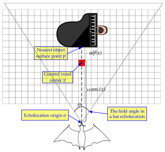 Like the bat echolocation system, the signed distance field (SDF) is a set of voxel grids where every voxel element contains its Euclidean distance to the nearest obstacle surface. For an n-dimensional space, the scene is represented through an n-dimensional grid of equally volumetric voxels. Similar to other fields (such as electric field, magnetic field, and gravitational field), the field strength in an SDF is expressed by the Euclidean distance. Each voxel x in an SDF contains two types of data, i.e., signed distance sdfi(x) and weight wi(x). The sdfi(x) represents the signed distance information between the voxel center x and its nearest object surface along the current raycasting ray, as illustrated in Figure 10. If the spatial position of the voxel center x is between the object surface and the sensor origin, the sdfi(x) sign on that side is positive, and vice versa is negative. Given the sensor origin o, the position p of the nearest pointcloud on the target surface, the current voxel center x, and , SDF can be formulated as follows: