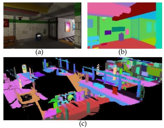 The qualitative reconstruction generated by our proposed volumetric–semantic scene representation system. (a) The colorful image stream is manufactured by the “subway” sequence. (b) The semantic image corresponds to (a), and the different colors in the semantic image represent the corresponding categories. (c) Volumetric–semantic scene reconstruction.