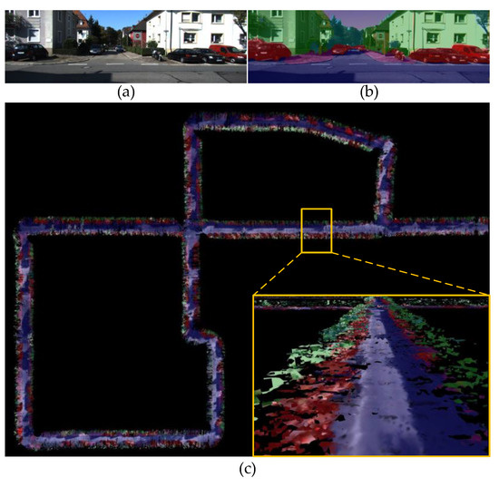 The top view of a reconstructed community street in the KITTI dataset. (a) The RGB image stream. (b) The semantic image produced by our proposed BatNet-tiny. (c) Volumetric–semantic scene reconstruction.