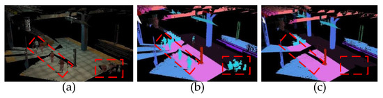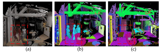 The qualitative comparison of different results when discarding a vertex from layer 5 in the hierarchical scene graph. (a) The geometric scene reconstruction. (b) The geometric–semantic scene reconstruction. (c) The geometric–semantic scene reconstruction with HSG which removed “person” vertices from layer 5.