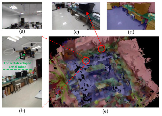 The real-world geometric–semantic scene representation experiments. (a) The visual feature state is transmitted from the self-developed drone. (b) The drone is collecting scene information in our office. (c) The RGB image frame was collected by the airborne ZED camera. (d) The semantic image produced by the proposed BatNet-tiny. (e) The volumetric–semantic scene reconstruction.