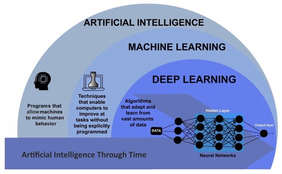 Deep learning is a subset of machine learning that uses artificial neural networks to learn from data. These neural networks are designed to mimic the structure and function of the human brain, allowing them to identify more complex patterns and make decisions based on the data they have been trained with [10,11]. Deep learning has revolutionized the field of artificial intelligence, enabling machines to perform tasks that were once thought to be impossible. One of the key advantages of deep learning is its ability to handle large and complex datasets [12]. Traditional machine learning algorithms struggle to make sense of data that is too vast or too complex for humans to process. On the other hand, deep learning algorithms can handle millions of data points and identify patterns that would be impossible for a human to detect [13,14]. Another advantage of deep learning is its ability to learn and improve over time [15]. Traditional machine learning algorithms commonly do not offer memory, requiring humans to manually adjust the parameters and settings to improve their performance. Some deep learning algorithms, such as Long Short-Term Memory [16] and Recurrent Neural Networks [17], can adjust themselves automatically based on the data they are processing. This means that deep learning algorithms can continue improving and evolving as they process more data (Figure 1) [18,19].