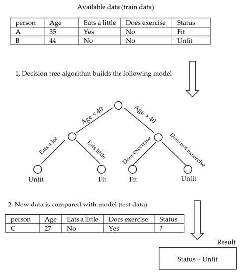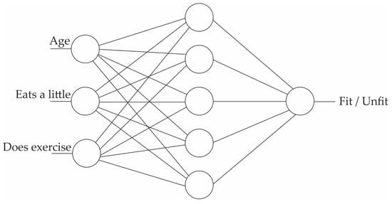 Probably the most important consideration in medicine is trustworthiness [128], which refers to the validity and reliability of a model. The trustworthiness of AI is closely related to the interpretability of the model and deals with the answer to this question: “How can people trust the AI-generated information when the result is not interpretable?” An example of an interpretable model is a decision tree [129], shown in Figure 2. The top node of the tree represents the entire dataset. It is the starting point for the decision-making process. Internal nodes represent features or attributes from the dataset. Each internal node makes a decision based on a specific feature. The branches that connect nodes represent the decision outcomes or choices based on the feature’s values. Finally, at the lowest level, the leaf nodes are the endpoints of the decision tree. They provide the final output, which can be a class label (for classification problems) or a numerical value (for regression problems). A decision tree algorithm builds such a tree based on the existing data. Once the tree is created, the unforeseen data could be checked against it and decided for the category or the value that should be assigned. In the example of Figure 2, the decision tree algorithm gets the available data of persons A and B and builds the model tree, which can identify the status of unforeseen person C. In terms of interpretability, the decision tree identifies person C as unfit, and the reason for such a classification is that “age < 40” and “eats a lot”. However, this is not the case with Figure 3, where a Multi-Layer Perceptron Neural Network is shown [130]. An MLP consists of many small computational units with an activation function that determines their output. To use the MLP, it should first be trained with the available data. Each data record runs through the network, and each neuron tunes itself so that the network’s final output converges to the right answer. At the end of the training phase, the MLP would be a collection of tuned neurons that were able to classify the unforeseen data. However, in terms of interpretability, it is usually impossible to look at an MLP and understand why it might label a person as fit or unfit since the network might have thousands of neurons organized in several layers. Indeed, many machine learning and deep learning models are like a black box, containing such a large amount of information that they are excessively difficult, if not impossible, to interpret.