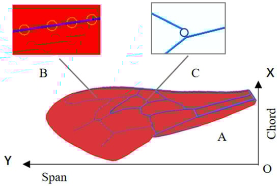 Previous researches found that resilin—generally, the resilin-bearing vein joints—was found to contribute a lot to the chordwise flexibility of the wings of insects such as dragonflies, beetles, and bumblebees [6,7,8,9,10]. Although some of the conclusions are based on speculation, the functions of resilin on insect wings have attracted much attention. Resilin is a polymeric rubber-like protein which can be stretched to over 300% of its original length before breaking and possesses a low elastic modulus, in the range of 0.1–3 MPa [11,12]. Mountcastle and Combes [10] demonstrated, by experiment, that the chordwise stiffness could be enhanced by 36% when a central resilin-bearing vein joint was fixed artificially. Later, they found that a resilin-bearing vein joint at the leading edge helped wasp wings to avoid damage in collisions [13]. In addition, resilin is considered to provide and store sufficient elastic strain energy to reduce the wing damage in Odonata [14,15] and periodically help wing-folding in beetles [16] and Asian ladybirds [17]. Inspired by the resilin-bearing joints in dragonfly wings, biomimetic timber joints were developed, and their high performance was analyzed [18]. As the morphology and distribution of resilin joints in insect wings are very complicated, most of the studies focus on a single joint without considering the effects on the overall wing structure.