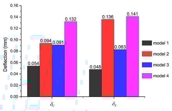An experimental method to measure the chordwise stiffness of bumblebee wing was proposed by Mountcastle and Combes [10,13]. By fixing the location in the leading edge, the force exerted on the trailing edge is measured with a given deflection at 85% of chord length from the leading edge. Then, the chordwise stiffness can be calculated by the measured force and deflection. A similar approach is applied in our simulation. The leading-edge vein is fixed at the position of 50% of span length, and the deflection δ C of a trailing-edge node is obtained when a concentrated force of 10−5 N is applied at about 85% of chord length in the trailing edge. δ C was ensured to be less than 5% of the chord length in the simulation. In addition, the spanwise deflection δ S is calculated in the same way, and the results of the four models are shown in Figure 3.