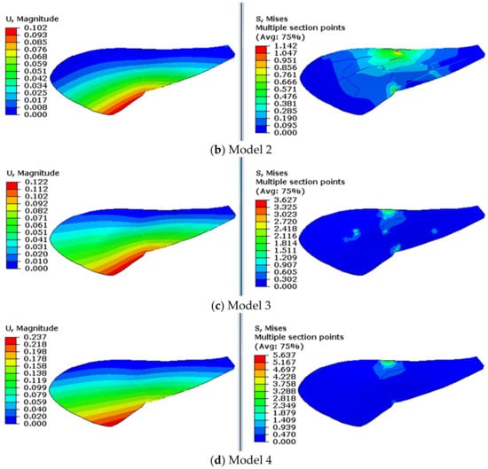 The contours of displacement and stress of the models are shown in Figure 4 and Figure 5. In chordwise deformation, displacement changes more gradually in the chord, and the stiffness along the chord decreases obviously when the resilin stripe is used in model 3 and model 4. As for the stress contours, stress concentrates along the vein stripes in model 2 and concentrates at the vein joints in model 3. When both resilin stripes and resilin joints are used, in model 4, these local stress concentrations disappear. The same situation was also observed in the stress contours in spanwise deformation, as shown in Figure 5. This illustrates that the coexistence of resilin joint and stripe can reduce local stress concentration in the middle areas of the wing in deformation. Considering the periodic deformation in flapping, this will benefit the fatigue resistance of the resilin-bearing areas.