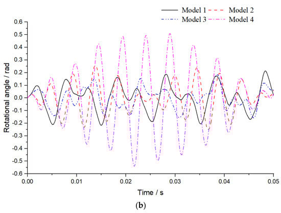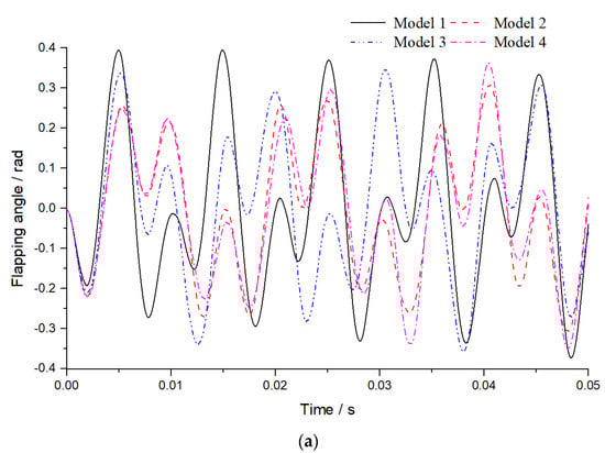 The analysis time is 0.05 s, about 10 flapping periods. The frequency of the excitation is 197 Hz, falling in between the natural frequencies of the first-order bending mode and second-order bending mode for model 1 and model 3 and between the first-order bending mode and first-order torsional mode for model 2 and model 4. The base vibration mode is bending for all the four models. Therefore, the flapping angles shown in Figure 6a are considerable, especially for model 1 and model 3. The maximum flapping angle of model 1 is about 25 , while the amplitude applied on the base is only 6 . 5 . As the natural frequencies of the torsional mode are very close to the excitation frequency for model 4, the rotational angles in the dynamic responses are very remarkable, as shown in Figure 6b. The maximum rotational angle of model 4 is up to 32 , while the applied amplitude on the base is only 5 . Therefore, the amplitude amplification effect is significantly enhanced by resilin joints and stripes in torsion vibration.