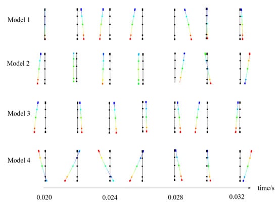 In previous studies, it was found that the cambered sections of deformed wings of dragonflies and honeybees are related to resilin joints [19,31]. This umbrella effect on wing shape is considered as helping to improve the aerodynamics of upstrokes and downstrokes in flapping [5,32]. The wing cross-sections at half-chord length are extracted. Figure 8 shows how the shape of the section changes in dynamic flapping during the time of two periods. There are concave and convex sections in addition to the initial straight ones. All the sections of the four models are cambered to a certain extent, especially at the maximum flapping angle. For example, the wing flaps downward from 0.026 s to 0.028 s, during which the section changes from convex to concave. It changes in reverse during the upstroke of 0.028 s to 0.03 s. At the initial moments of upstrokes and downstrokes (supination and pronation), the cross-sections of the wing are always of an umbrella-like shape to meet the requirements of high lift [32]. The curved shape reverses in the following flap in order to produce drag reduction. The deformation is obtained without considering the aerodynamic load. Maximum rotation and camber could be observed in model 4 with both resilin joints and stripes under the driven motion on the wing base. This shows that the rotation and camber of the wing present in dynamic flapping are the combined effects of both resilin joints and stripes. Due to the material characteristics of resilin, there is no doubt that it will reduce wing stiffness when it appears. But the two different forms are believed to be an optimization of structure properties such as local deformation and stress distribution. In aerodynamic analysis, especially fluid-structure coupling analysis, the flexibility effect of resilin should be considered comprehensively.