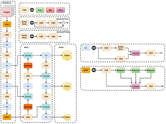 The YOLOv5 backbone network consists mainly of the CSP, CBS, and SPPF structures. The CSP structure mainly draws on the idea of the cross-stage network CSPNet [32], where the input features are processed in two parts. The main part extracts features step by step through convolution, normalization, and activation functions, and the branches simply adjust the channels through convolutional layers. By dividing the gradient information, a large amount of redundant gradient information is eliminated. The CBS structure consists of a convolution, Conv, a normalized BatchNorm [33], and an activation function, SiLU [34], which is used to extract the features of the model. The SPPF structure serially passes the input features through multiple 5 × 5 maximal pooling layers and then extracts the stacked features via the CBS network structure, which can increase the receptive field of the network and enhance the network’s characterization capability.