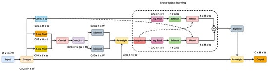 The general structure of EMA is shown in Figure 5. On the one hand, two coded features are connected in the image height direction and made to share the same 1 × 1 convolution without dimensionality reduction in the 1 × 1 branch by a similar process as CA. After decomposing the output of the 1 × 1 convolutional into two vectors, two nonlinear Sigmoid functions are used to fit a 2D binary distribution on the linear convolution. To realize different cross-channel interaction features between two parallel routes in a 1 × 1 branch, the two-channel attention maps within each group are aggregated together by simple multiplication. On the other hand, the 3 × 3 branch captures local cross-channel interactions via 3 × 3 convolutional to expand the feature space. In this way, EMA not only encodes inter-channel information to adjust the importance of different channels but also saves precise spatial structure information into the channels.