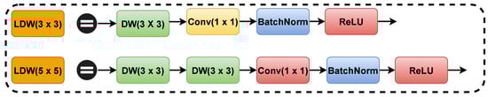 The LDW convolutional block consists of Conv 1 × 1, DW3 × 3, BatchNorm, and ReLU activation functions. DSC (Deep separable convolution) consists of Conv 1 × 1 and DW 3 × 3. DSC dramatically reduces the convolutional parameters. BatchNorm speeds model convergence and improves the stability of the model. The ReLU activation function increases network non-linearity and prevents the gradient from disappearing. In addition, we use two DW 3 × 3 instead of one DW 5 × 5. This is because two DW 3 × 3 can achieve the same effect as one DW 5 × 5 with smaller parameters.