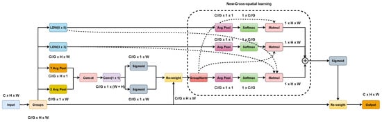 The LDW-EMA is composed of four branches: the principal branch, the coordinate branch, the 3 × 3 LDW, and the 5 × 5 LDW. Firstly, we used LDW 3 × 3 to replace the initial Conv 3 × 3. Then, we added a new 5 × 5 LDW branch and merged features from that branch with coordinate branch features for learning purposes. The new-cross-spatial learning consists of coordinate branches, LDW 3 × 3 and LDW 5 × 5, which can efficiently learn more multi-scale feature data.