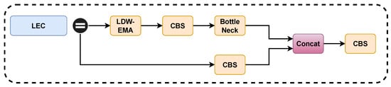Next, we fuse the proposed LDW-EMA with C3 of the YOLOv5 model Backbone to form the new module LEC. The overall structure of the LEC is shown in Figure 8. We replace the two C3 structures behind the Backbone layer with LEC, this is because the deeper features of the model are more difficult to extract and require more attention mechanisms to help, the shallow features can generally be extracted by the model more easily and accurately.