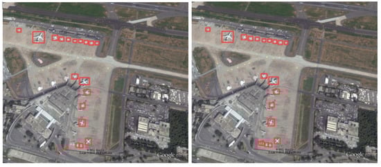 Thirdly, Figure 15 illustrates the detection results of the target on multiple scales. The background information in Figure 15 is complex and the aircraft types are characterized by a multi-scale distribution. YOLO-DRS can greatly reduce the problem of missed detection.