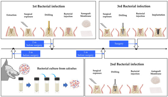 Illustration of bacterial culture and protocol used to induce infection within extraction sockets in mongrels. Bacterial culture from mongrel’s calculus was conducted 3 m before the implant placement. The first bacterial infection, simultaneously with tooth extraction, was performed 2 m before surgery. The second bacterial infection was induced 1 m before surgery. Bone graft and membrane were placed in the extraction socket during the first and second bacterial infections. The third bacterial infection was performed during implant placement while bone graft and membrane were not used.