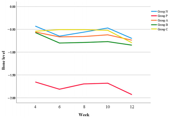 Compared to the Group N, Group P showed a significantly more bone resorption (Figure 2). Group A, B, and C showed bone resorptions of less than 1 mm as Group N. There was no significant difference among Group A, B, and C (p = 0.054). Regarding the changes of bone level according to time, Group A showed significantly less bone resorption than Group C at 6 w postoperatively (p < 0.05). However, there was no significant difference in Group N, A, B, and C after 6 w.