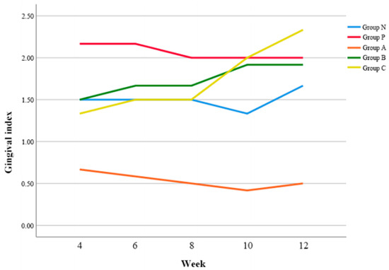 In general, Group P showed higher GI values than Group N, and Group A showed lower GI values than Group N (Figure 3). When compared to Group N, there was no significant difference of GI values in Group A, B, and C, respectively.