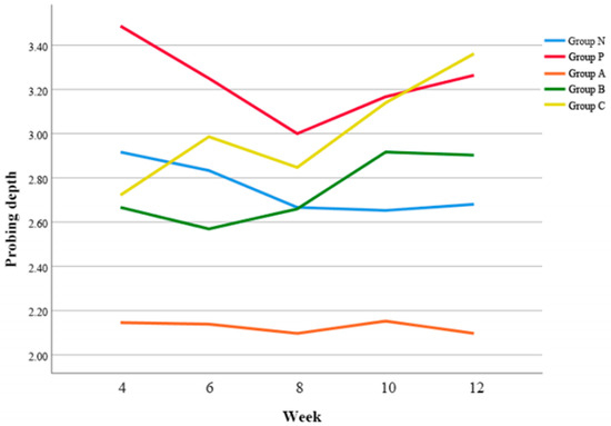 At 4 w postoperatively, Group A exhibited the smallest PD (p < 0.01) (Table 6). Also, it was revealed that Group B showed significantly smaller PD than Group P at 6 w postoperatively (p < 0.01), however, Group C demonstrated the deepest PD at 12 w postoperatively (p < 0.01).