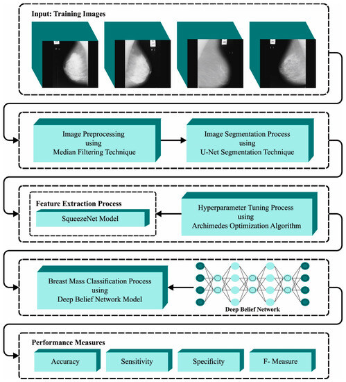 In this article, we presented an automated breast mass classification approach named the BMCA-AOADL technique on Digital Mammograms. The main intention of the BMCA-AOADL technique was to exploit the DL model with a bio-inspired algorithm for breast mass classification. In the presented BMCA-AOADL approach, MF-based noise removal, U-Net segmentation, the SqueezeNet feature extractor, AOA-based hyperparameter tuning, and the DBN classification were involved. Figure 1 portrays the workflow of the BMCA-AOADL system.
