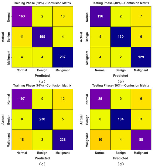 In Table 2 and Figure 5, the BC classification outcome of the BMCA-AOADL system is demonstrated with 60:40 of the TR set/TS set provided. The results indicate that the BMCA-AOADL technique effectually categorized three classes. On the 60% TR set, the BMCA-AOADL technique gained average , , , and of 96.11%, 94.09%, 97.10%, and 94.07%, respectively. Moreover, on the 40% TS set, the BMCA-AOADL algorithm offered average , , , and of 95.83%, 93.74%, 96.88%, and 93.73%, correspondingly.