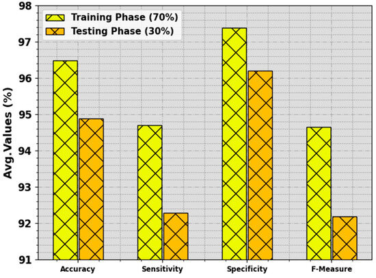 In Table 3 and Figure 6, the BC classifier outcome of the BMCA-AOADL algorithm is depicted with 70:30 of the TR set/TS set provided. The simulation value showed that the BMCA-AOADL system effectively categorized three classes. On the 70% TR set, the BMCA-AOADL system reached average , , , and of 96.48%, 94.71%, 97.38%, and 94.66%, correspondingly. Furthermore, on the 30% TS set, the BMCA-AOADL methodology obtained average , , , and of 94.89%, 92.29%, 96.20%, and 92.19%, correspondingly.