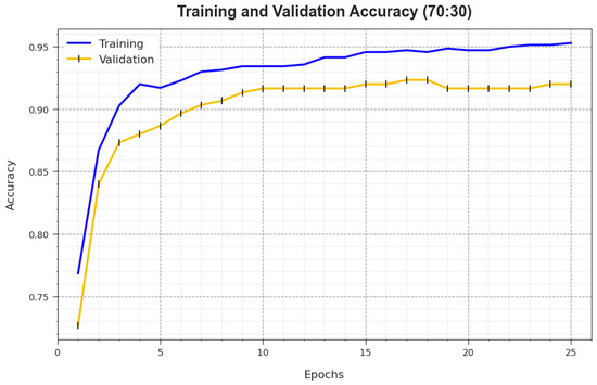 Figure 7 illustrates the training accuracy and of the BMCA-AOADL system at 70:30 of the TR set/TS set. The is defined by the assessment of the BMCA-AOADL system on the TR dataset whereas the is computed by estimating the performance on a separate testing dataset. The outcomes displayed that and caused an upsurge with an increase in epochs. Therefore, the performance of the BMCA-AOADL technique improved upon the TR and TS dataset with a rise in the number of epochs.