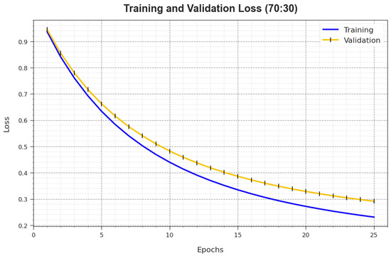 In Figure 8, the and curves of the BMCA-AOADL system at 70:30 of the TR set/TS set are depicted. The defines the error among the predictive solution and original values on the TR data. The represents the measure of the performance of the BMCA-AOADL method on individual validation data. The outcomes show that the and generally decreased with rising epochs. This portrayed the enhanced performance of the BMCA-AOADL methodology and its ability to produce accurate classification. The lesser value of and demonstrated the enhanced performance of the BMCA-AOADL method in capturing patterns and relationships.