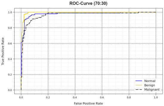 In Figure 10, a ROC outcome of the BMCA-AOADL method is demonstrated at 70:30 of the TR set/TS set. The outcome value exposed that the BMCA-AOADL approach led to better values of ROC. Moreover, it was obvious that the BMCA-AOADL technique achieved superior values of ROC in three classes.