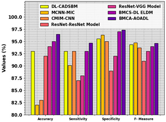 The performance of the BMCA-AOADL technique is compared with recent DL models in Table 4 and Figure 11 [12]. The result stated that the MCNN-MIC and CMIM-CNN models showed the lowest performance. At the same time, the ResNet, ResNet-VGG, and BMCS-DL ELDM models illustrated moderately closer results. Additionally, the DL-CADSBM model reached considerable performance with , , , and of 82%, 90.13%, 96.31%, and 94.76%, respectively. But the BMCA-AOADL technique surpassed the other ones with improved , , , and of 96.48%, 94.71%, 97.38%, and 94.66%, respectively. Thus, the BMCA-AOADL technique can be applied to the automated breast mass classification process.