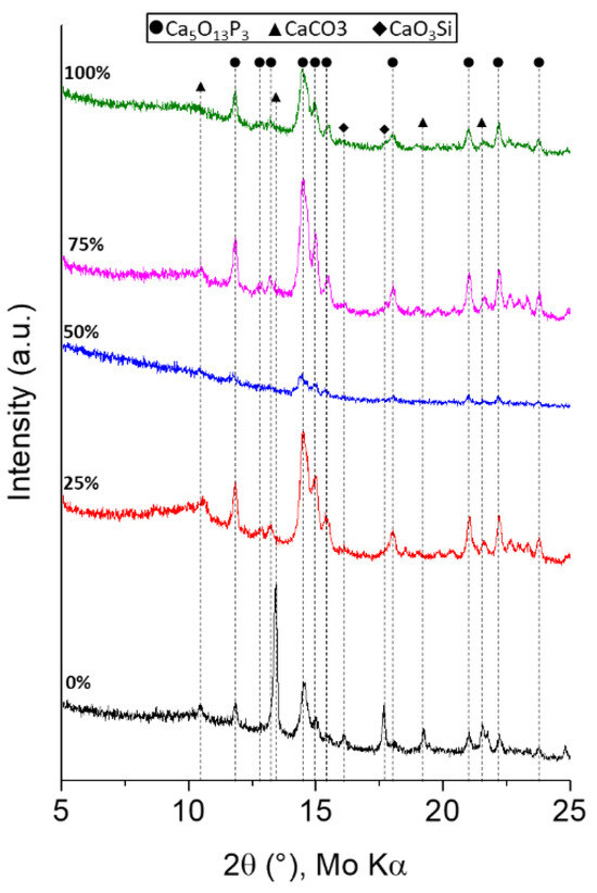 The x-ray diffraction (XRD) patterns of the as-prepared materials investigated within this work are shown in Figure 1. The patterns indicate that the samples are glass-ceramic materials. On the one hand, they are x-ray amorphous, since all of them show a broad hump centered at approximately 10° which is attributed to the amorphous silica network [26]. On the other hand, the XRD investigation revealed that crystallization had occurred, since diffraction peaks were attributed to calcium-content crystalline phases such as hydroxylapatite (Ca5(PO4)3OH, PDF 96-901-4314), calcite (CaCO3, PDF 96-901-6707) and wollastonite (CaSiO3, PDF 96-900-5779), which have also been identified in all of the patterns. The intensity and the shape of the crystalline peaks varies as a function of the theoretical (nominal) wt.% CaO used in the sol–gel approach. When the theoretical percentage is lower than ca. 40, the main crystalline phase detected is hydroxylapatite, while when the wt.% of CaO is higher than 40, besides the peaks related to hydroxylapatite, diffraction peaks attributed to calcium oxide and calcium silicate crystalline phases are also detected. Interestingly, the 50% group sample, which contained 32.1 wt% CaO, was found to be mainly X-ray amorphous, since its pattern only showed broad- and low-intensity hydroxylapatite diffraction peaks.