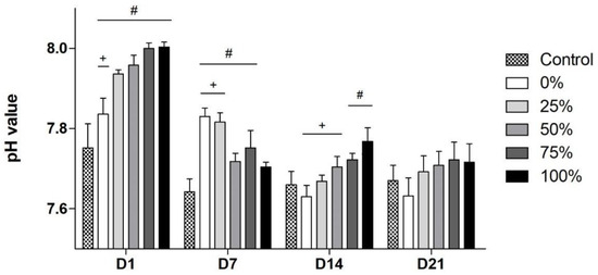 pH values for the different bioactive glass (BG) groups over time. (+) indicates significant differences to the original 45S5-BG composition (100% group); (#) indicates significant differences compared to the control group.