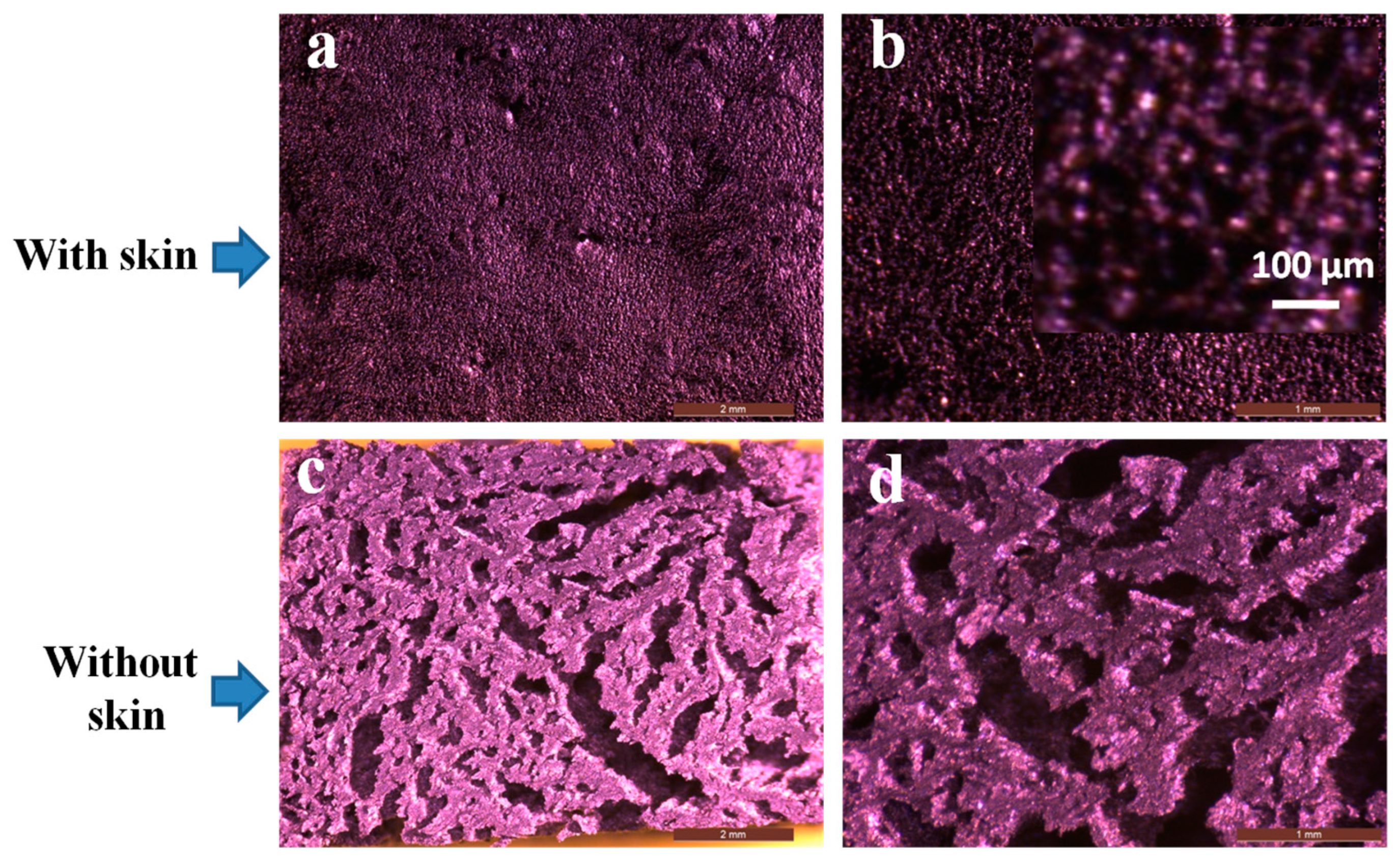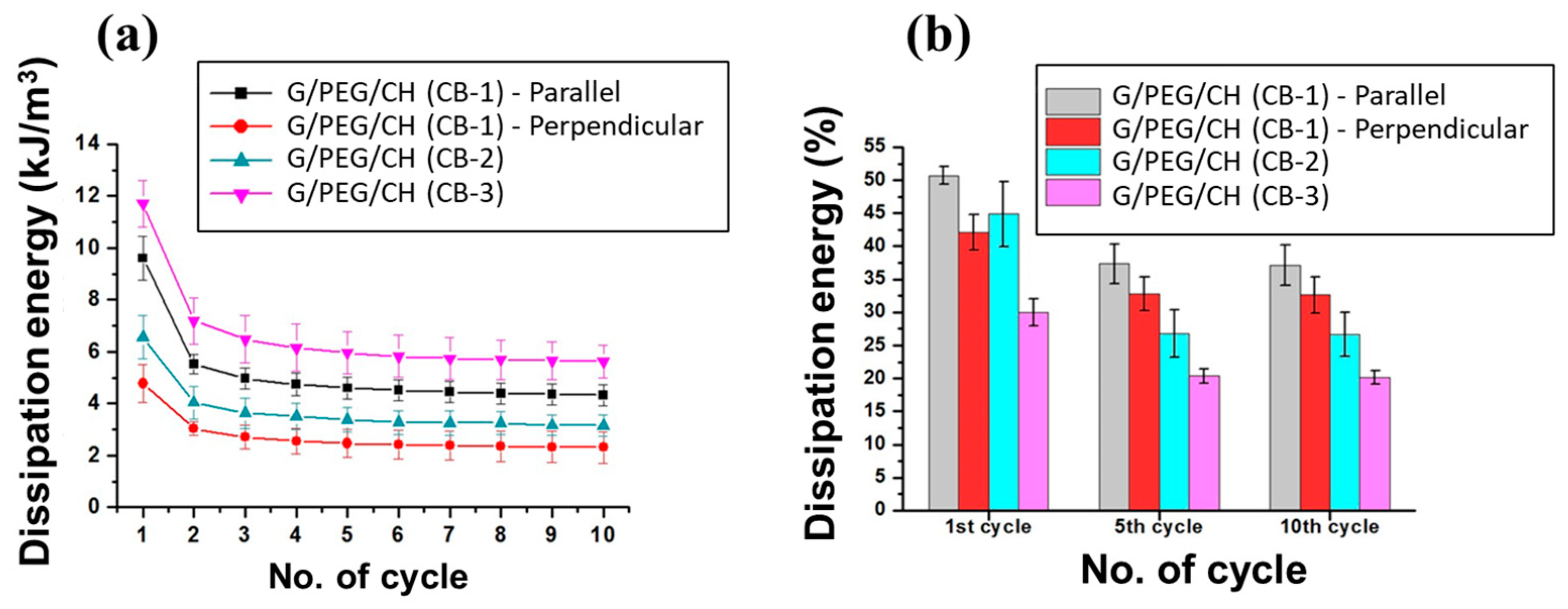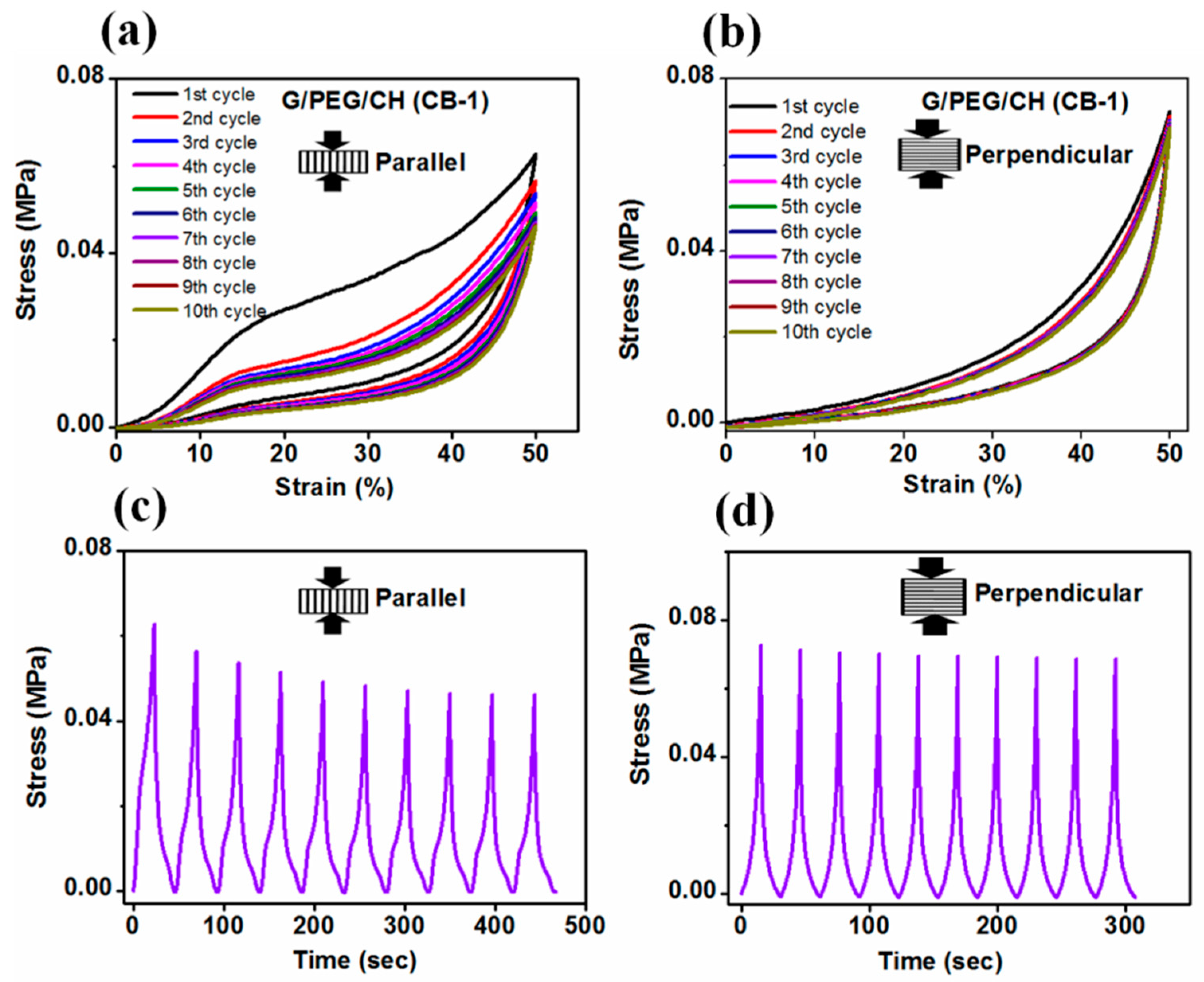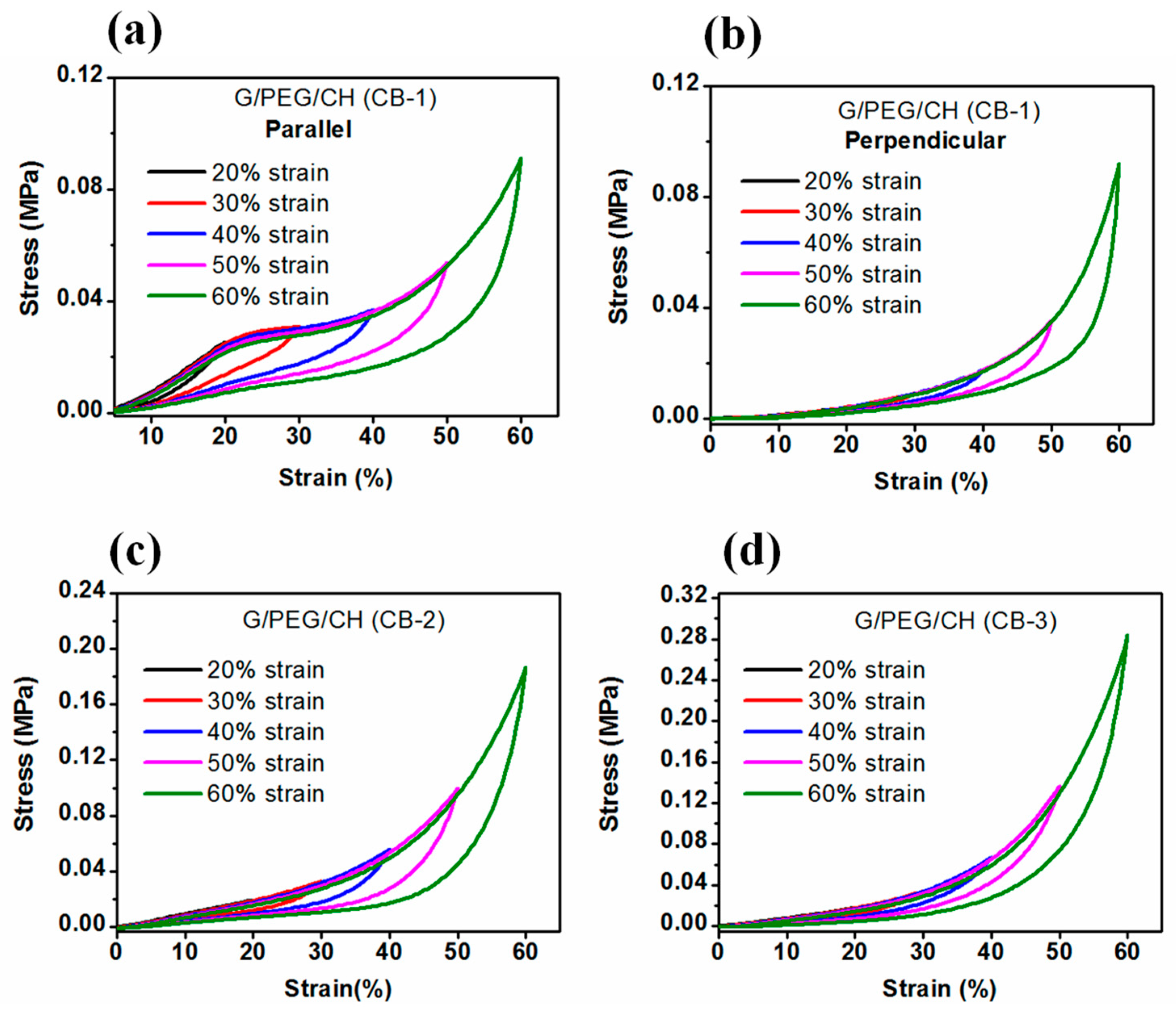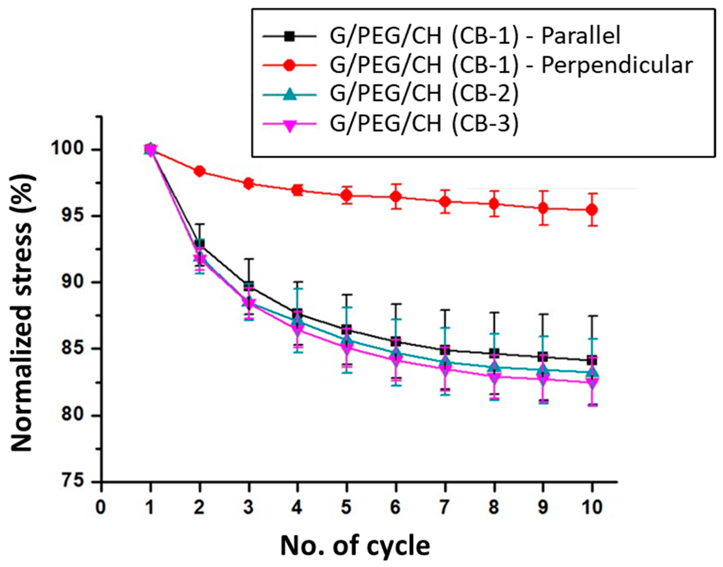 | G/PEG/CH (CB-2) G/PEG/CH (CB-2) | 0.128 ± 0.01 0.112 ± 0.01 | 0.132 ± 0.03 0.106 ± 0.04 | Parallel to smaller macropore channels Perpendicular to smaller macropore channels | Intermediate behavior |