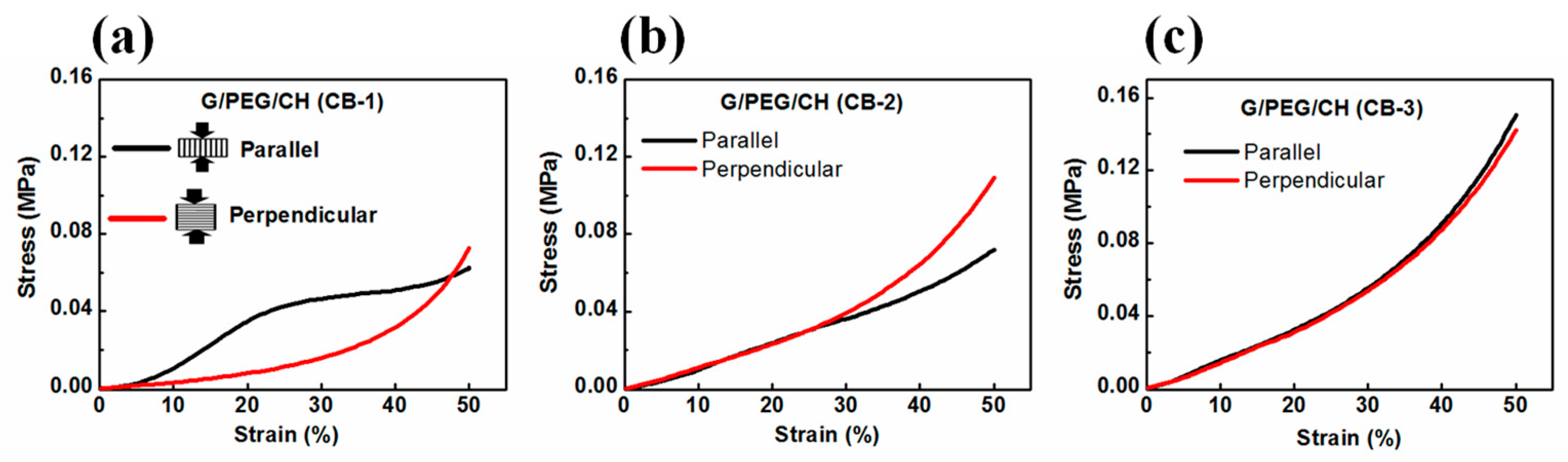 | G/PEG/CH (CB-1) | 0.230 ± 0.05 | 0.053 ± 0.01 | Parallel to smaller macropore channels | Anisotropic |
