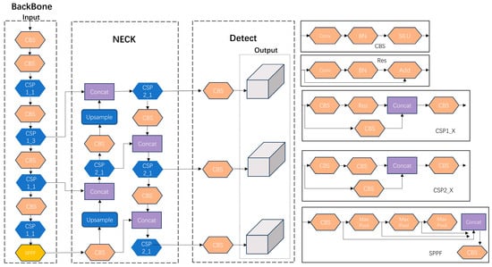 YOLOv5 is a contemporary and GPU-optimized target detection model. Within the current YOLOv5 framework, distinct variants exist, namely YOLOv5s, YOLOv5n, YOLOv5l [], YOLOv5m, and YOLOv5x []. Among this array of network models varying in size, YOLOv5s stands out due to its purposeful network simplification, which is tailored for edge deployment to facilitate real-time target detection. Furthermore, YOLOv5s boasts notable advantages, including a heightened detection stability, accuracy, and simplified deployment. Its performance surpasses those of YOLOv5n, YOLOv7, and YOLOv8 in specific scenarios, rendering it an optimal selection for undertaking comprehensive inspections using large-scale camera systems. YOLOv5s comprises three primary components: the Neck, the Backbone, and the prediction. The effective interplay between these distinct modules contributes to its commendable performance. YOLOv5 introduces several enhancements, encompassing Mosaic data augmentation at the input stage along with adaptive anchor frame computation []. The Backbone component incorporates the focus and CSP_X structures, while the Neck segment integrates the CSP2 structure, all working cohesively to amplify the amalgamation of network features []; the use of spatial pyramidal pooling to fuse different sensory fields; the CIOU loss is utilized as the loss function of the bounding box []; and the overlapping targets are improved via NMS non-maximal suppression []. The structure of YOLOv5 is shown in Figure 2.