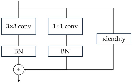 The RepvggBlock encompasses Conv3 × 3 + BN (Batch Normalization), Conv1 × 1 + BN, and identity branches. These branches are assigned weights prior to their activation function application in subsequent network iterations. The RepvggBlock configuration is illustrated in Figure 3.