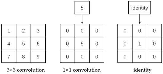 (2) The convolutional kernel is transformed into a 3 × 3 scale size. Following the initial step, the model branches into two: a 1 × 1 convolutional layer and an identity branch. For 1 × 1 convolution, the convolution kernel evolves from a 1 × 1 configuration to a 3 × 3 convolutional kernel, with the weight of the null convolution set to 0. In the identity branch, a 3 × 3 convolution kernel is employed with the center weight set to 1 and the remaining weights set to 0. This substitution is depicted in Figure 4. Ultimately, the convolution structure of every branch in the model is transformed into a 3 × 3 convolution. The corresponding weights and biases are subsequently aggregated, amalgamating the branches into a unified 3 × 3 convolution.