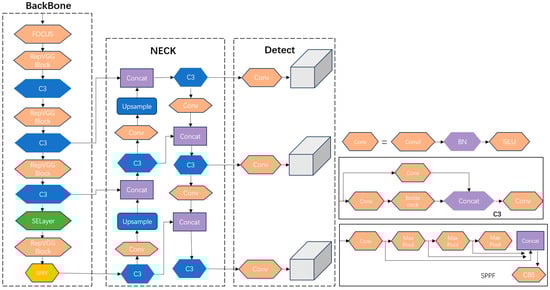 The network model structure of YOLOv5-MS is presented in Figure 6. To enhance the model’s detection mAP and speed, YOLOv5s is subjected to the following improvements: (1) incorporating an SE module into the model to enhance its feature extraction capabilities; (2) substituting the original Conv convolution in the model with RepvggBlock to decrease the model’s complexity and increase its detection speed; (3) introducing a focus structure to preserve essential information by reducing the dimensionality, thereby mitigating the risk of model overfitting to some extent.