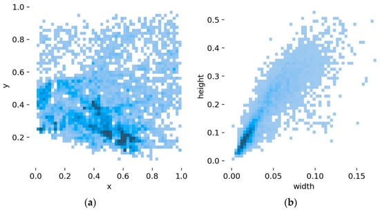 Figure 8 provides a visual representation of the dataset, depicting the size and distribution of the pedestrians. Figure 8a displays the distribution of the centroid of the pedestrian detection frame after normalizing the image size. The figure reveals that pedestrians are predominantly situated in the lower–middle portion of the image. Figure 8b portrays details concerning the ratio of the object detection frame to the image size. Evidently, a significant portion of the target pedestrians appear to be distant within the images, with the majority being smaller targets. This insight from the dataset contributes to the refinement of the network structure for optimal performance.