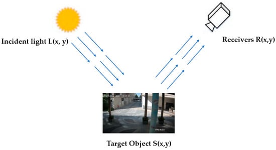 During the process of image acquisition, the inherent device components and environmental conditions can potentially result in image quality degradation. To tackle this issue, Retinex image enhancement technology is implemented as a solution. This technology emulates the human visual system by portraying the relative reflectance of objects in diverse lighting contexts. Leveraging the concept of color permanence intrinsic to the human visual system, the Retinex theory is strategically applied to address these considerations []. The principle of the Retinex is shown schematically in Figure 9.